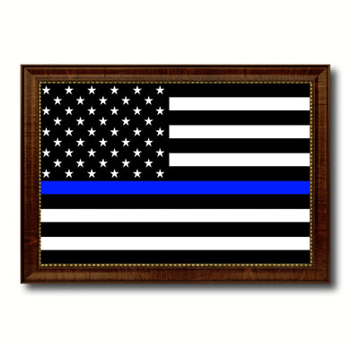 Thin Blue Line Honoring our Men and Women of Law Enforcement American Police USA Flag Canvas Print with Brown Picture Frame Home Decor Wall Art Gift Ideas
