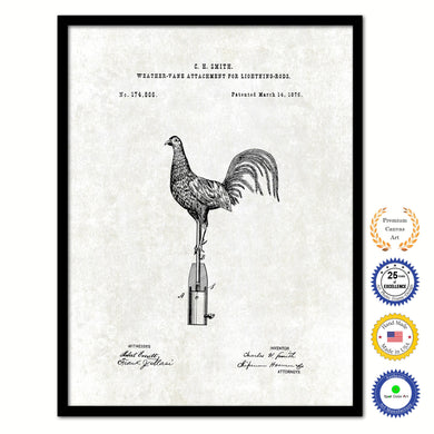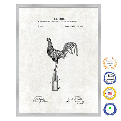 1876 Farming Weather Vane Attachment for Lightning Rods Antique Patent Artwork Silver Framed Canvas Print Home Office Decor Great for Farmer Milk Lover Cattle Rancher