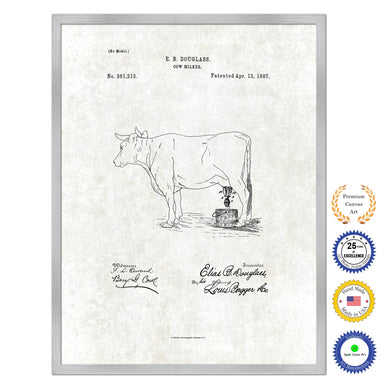 1887 Farming Cow Milker Antique Patent Artwork Silver Framed Canvas Print Home Office Decor Great for Farmer Milk Lover Cattle Rancher