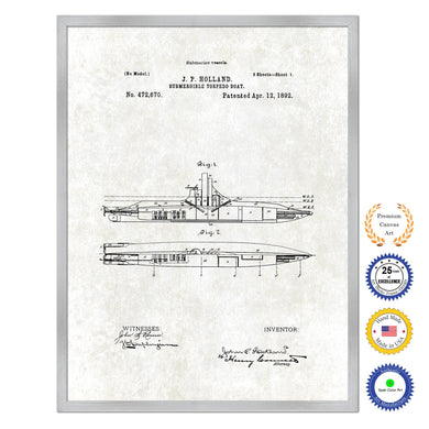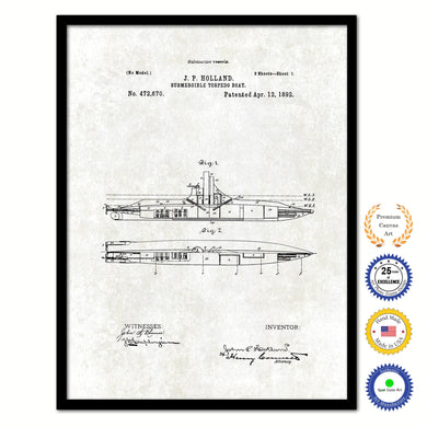 1892 Submergible Torpedo Boat Old Patent Art Print on Canvas Custom Framed Vintage Home Decor Wall Decoration Great for Gifts