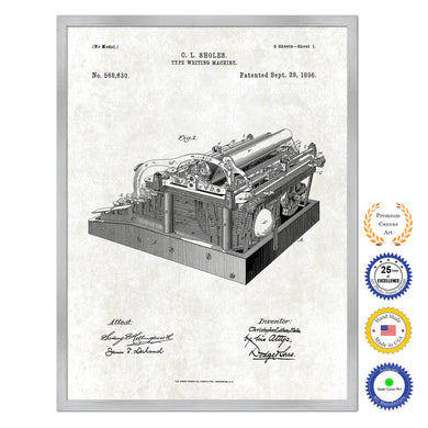 1896 Type Writing Machine Old Patent Art Print on Canvas Custom Framed Vintage Home Decor Wall Decoration Great for Gifts